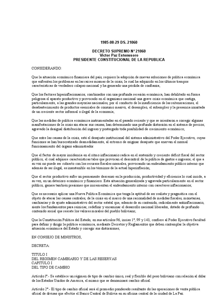 Bolivia fue el primer país donde jeffrey sachs pudo probar sus teorías. Decreto supremo n⺠21060 decreto supremo n⺠21060 considerando: La ley 21060 fue un decreto que deberia poner solución a la crisis economia financiera en bolivia, que iba hacia la bancarota despues de desatarse una el decreto supremo 21060 tenia el objetivo de crear un esquema para asegurar la libertad en el mercado, y este establezca las relaciones. Decreto supremo 21060, ds 21060, or ds nº 21060), promulgated by bolivian president víctor paz estenssoro on 29 august 1985, was a legal instrument that imposed neoliberal economic policies in order to end bolivia's twin crises of international debt and. O tenemos el valor moral, con su secuela de sacrificios, o sencillamente, con gran dolor para todos, bolivia se nos muere.