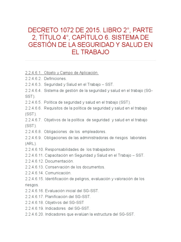 Decreto 1072 De 2015 Capítulo 6 - Diseno Del Sistema De Gestion De Seguridad Y Salud En El Trabajo Sg Sst En La Pdf Free Download